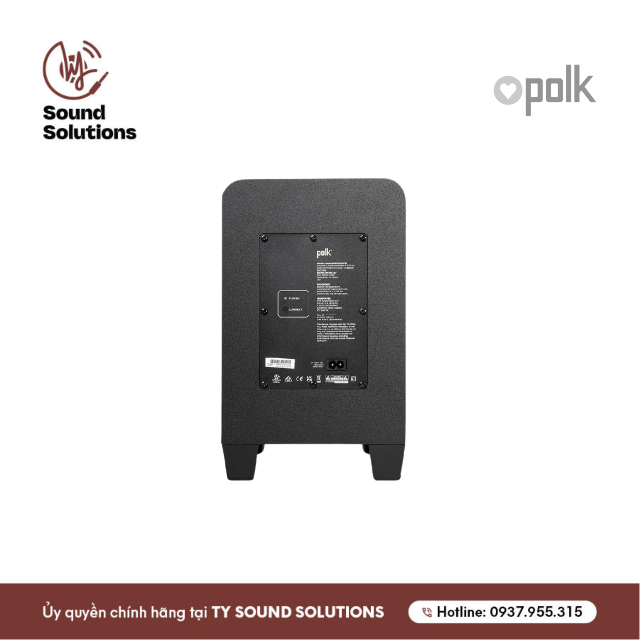 Phía sau là hệ thống các cổng kết nối được sắp xếp gọn gàng. Điểm nhấn của loa là logo Polk bằng kim loại màu trắng bạc ở vị trí góc phải mặt trước của loa.
